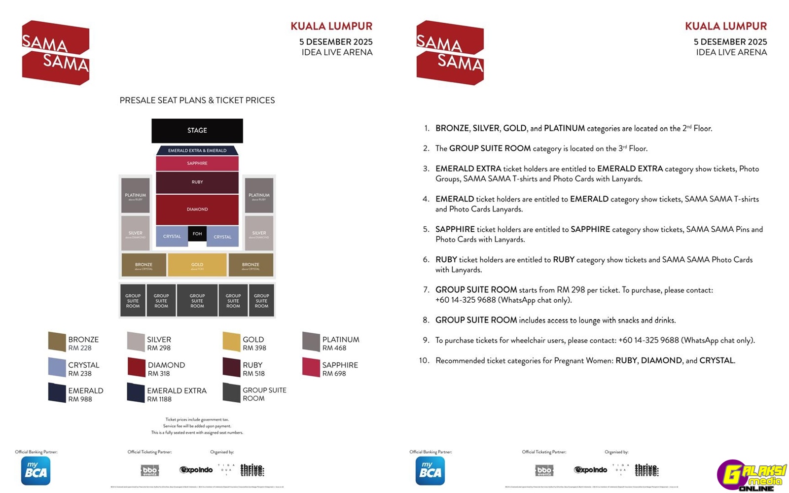 Dimulai dengan harga RM228, terdapat 11 kategori tiket iaitu Bronze, Crystal, Silver, Diamond, Gold, Platinum, Ruby, Sapphire, Emerald, Emerald Extra dan Group Suite boleh dimiliki menerusi pembelian daripada BBO Events dan samasamatur.com.