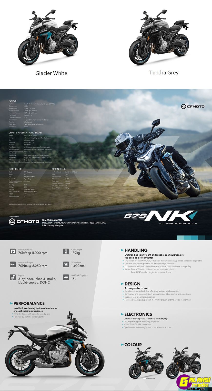 Ditawarkan dalam dua pilihan warna yang bergaya dan menyerlah iaitu Glacier White dan Tundra Grey, model ini boleh dimiliki dengan harga permulaan hanya RM33,888 (tidak termasuk cukai jalan dan insurans), menjadikannya pilihan terbaik bagi penunggang baharu mahupun berpengalaman. CFMOTO 675NK kini boleh ditempah di semua pengedar sah CFMOTO seluruh Malaysia.