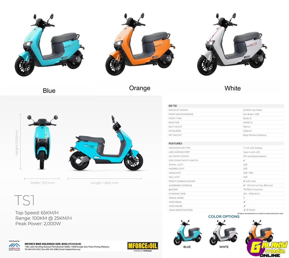 Ditawarkan pada harga RM4,288.00 (tidak termasuk cas pendaftaran dan insurans), EZI TS1 hadir dalam tiga pilihan warna iaitu Blue, Orange dan White, sekali gus memenuhi keperluan pelbagai gaya penunggang urban. Model EV ini boleh didapati di semua pengedar sah Mforce di seluruh Malaysia.