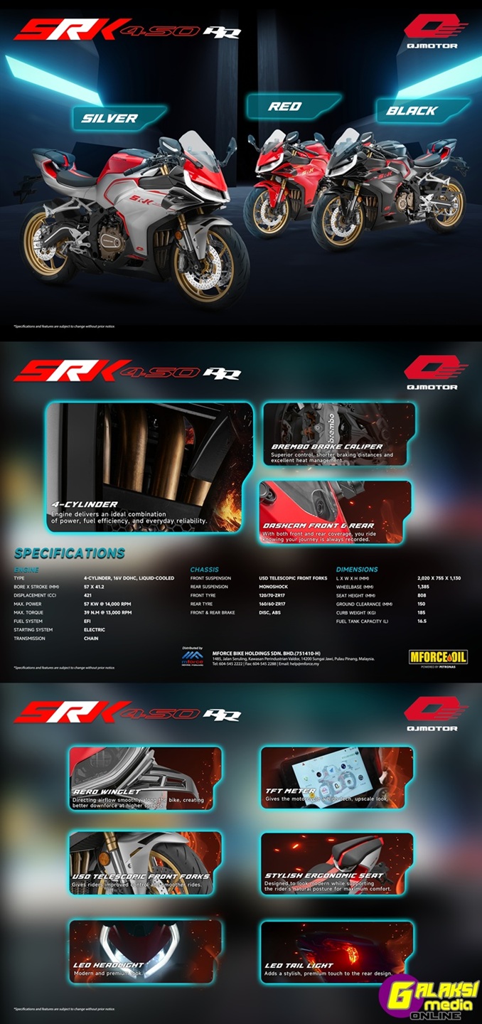 QJMOTOR SRK450RR pula ditawarkan pada harga RM25,888.00 (tidak termasuk cukai jalan dan insurans) dengan pilihan warna Black, Silver dan Red. Model ini dikuasakan oleh enjin 4-silinder, 16-injap DOHC dengan sistem penyejukan cecair bersesaran 421 cc, yang menjana kuasa maksimum 57 kW pada 14,000 rpm serta tork maksimum 39.0 Nm pada 13,000 rpm. Sistem suntikan bahan api EFI, klac basah berbilang plat, penghidup elektrik serta transmisi pacuan rantai dipadankan dengan tangki bahan api berkapasiti 16.5 liter. Dari aspek pengendalian, QJMOTOR SRK450RR turut menggunakan fork terbalik Marzocchi di bahagian hadapan dan penyerap hentak belakang jenis gegelung teleskopik dengan redaman minyak. Sistem membrek terdiri daripada cakera berkembar Brembo di hadapan bersaiz 300 mm dan cakera belakang 240 mm, disokong oleh ABS dua saluran.