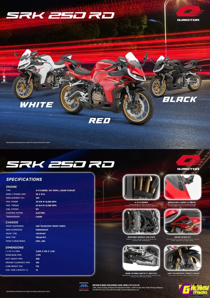Setiap pembelian QJMOTOR SRK250RD dan QJMOTOR SRK450RR disertakan dengan jaminan pengeluar selama dua tahun dengan perbatuan tanpa had, serta akses kepada alat ganti tulen secara dalam talian melalui platform perkhidmatan Mforce Bike Holdings Sdn. Bhd. Kedua-dua model ini kini tersedia di pasaran Malaysia dan boleh didapati di semua pengedar sah Mforce di seluruh negara.