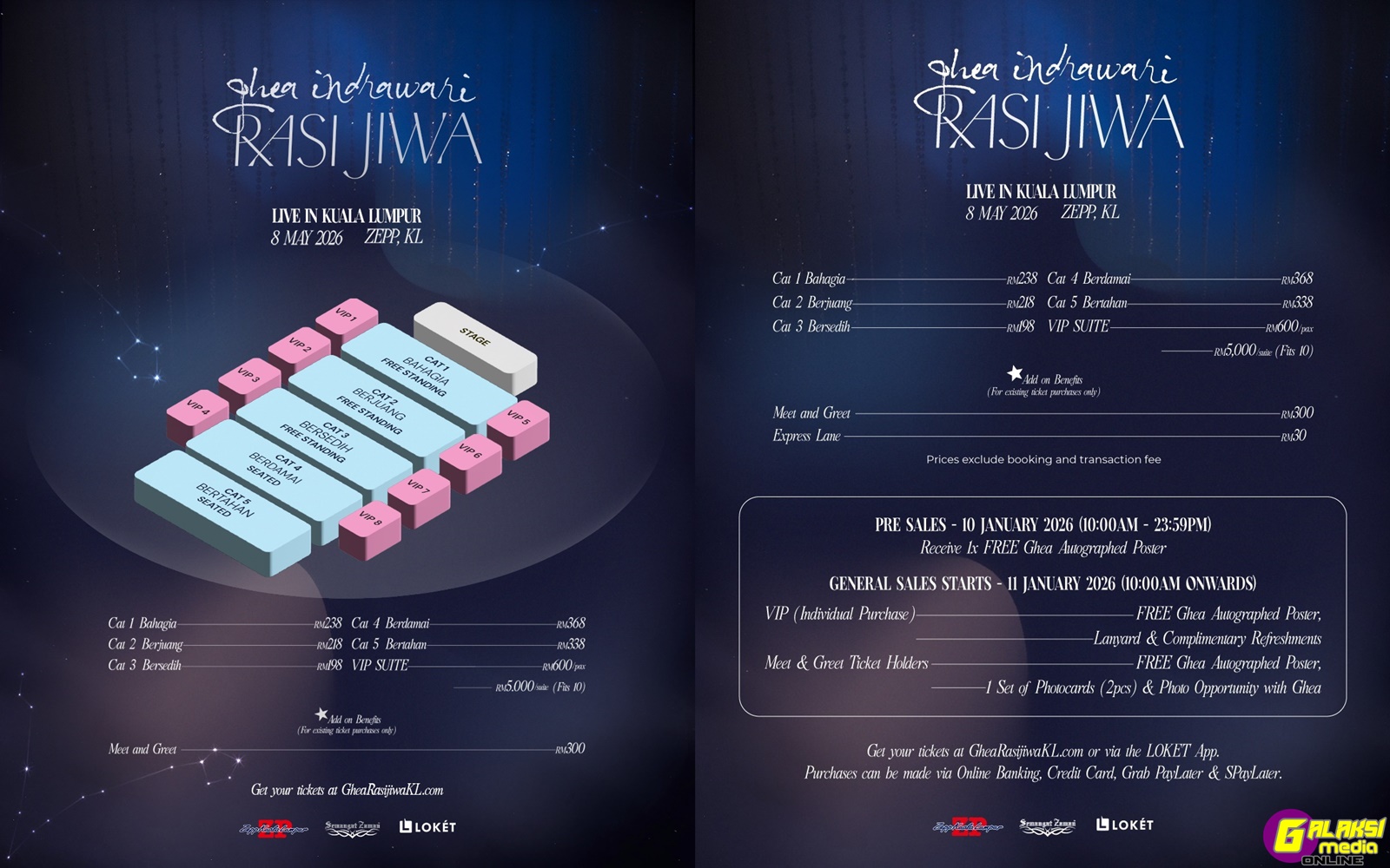 Tiket konsert “RASI JIWA – Live in Kuala Lumpur” boleh didapati menerusi laman web rasmi https://GheaRasiJiwaKL.com serta platform jualan tiket LOKET.