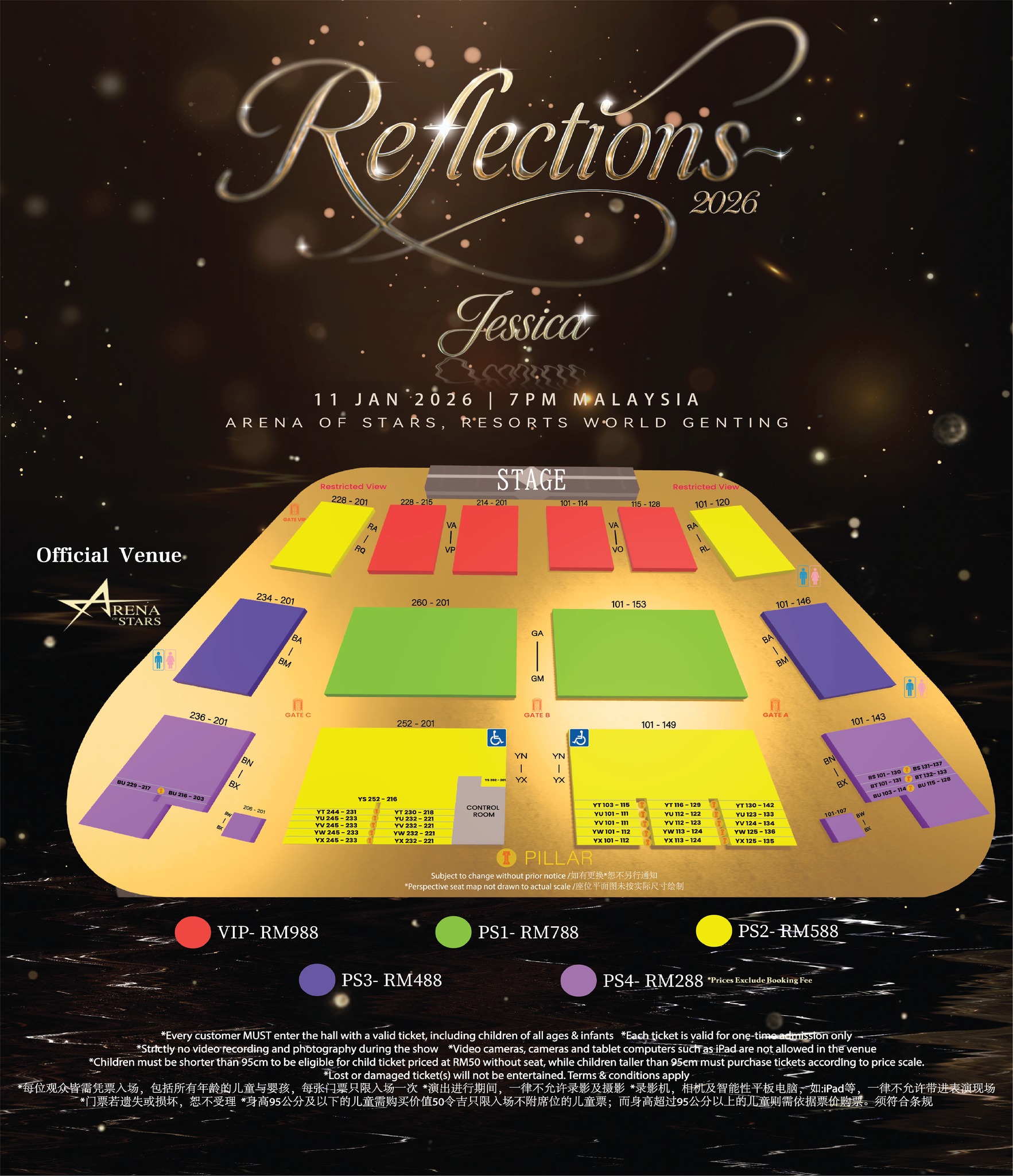Konsert bertajuk Jessica Concert Tour 2026 <Reflections> in Malaysia akan berlangsung pada 11 Januari 2026 hari Ahad pada jam 7.00 malam bertempat di Arena of Stars, Resorts World Genting. Persembahan ini bakal menjadi hadiah istimewa buat para peminat yang digelar Golden Stars, dengan sebuah pengalaman persembahan yang memukau dan penuh nilai artistik.