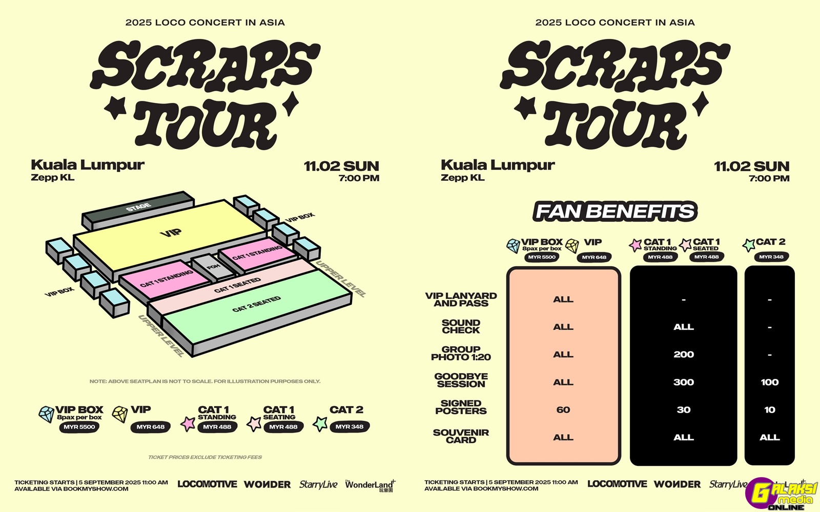 Tiket datang dengan pelbagai faedah peminat (fan benefits) dan akan mula dijual pada hari Jumaat, 5 September, jam 11 pagi menerusi my.bookmyshow.com pada harga-harga berikut, tertakluk pada fi tiket: