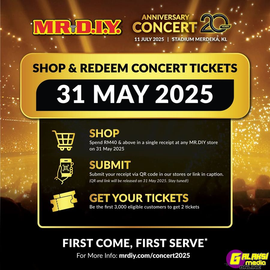 Mulai 31 Mei 2025, pelanggan hanya perlu berbelanja RM40 ke atas dalam satu resit di mana-mana cawangan MR.DIY di seluruh negara untuk berpeluang menebus dua (2) tiket konsert percuma. Borang penebusan boleh diakses dengan mengimbas kod QR yang terdapat pada poster rasmi di kedai atau layari laman web MR.DIY. Tiket adalah terhad kepada 3,000 penebusan pertama yang layak — jadi jangan tunggu lama-lama!