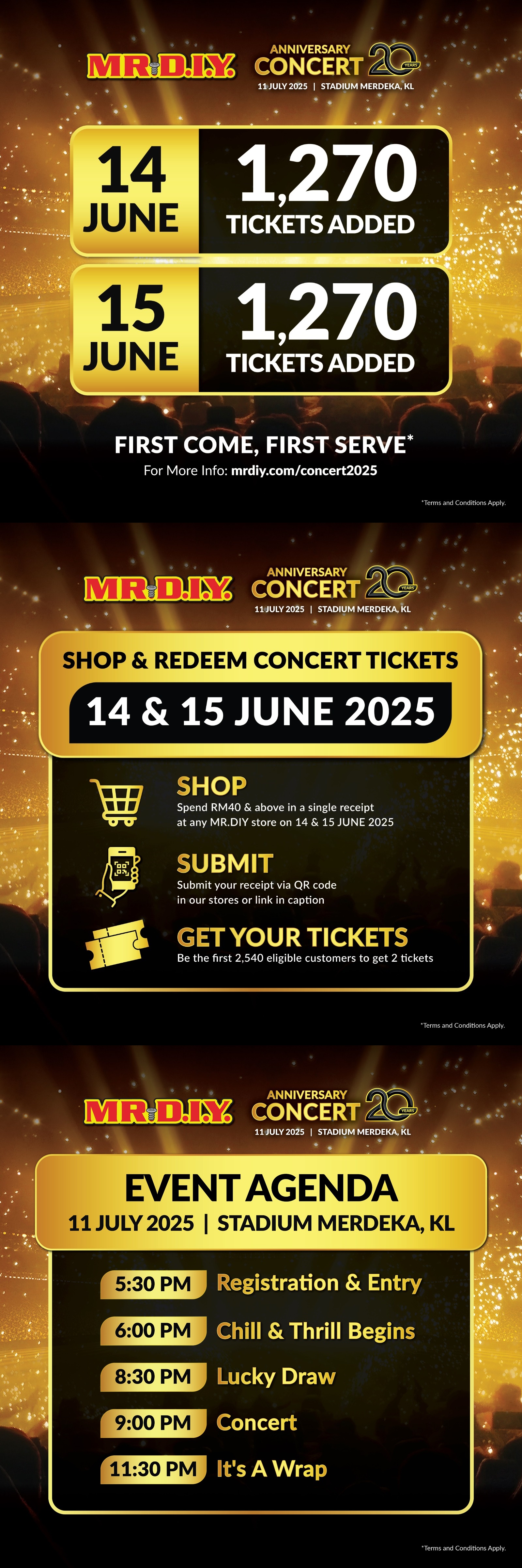 Bermula 14-15 Jun, pelanggan hanya perlu berbelanja minimum RM40 di mana-mana cawangan MR.DIY seluruh negara untuk berpeluang menebus dua (2) tiket konsert percuma. Anda hanya perlu mengimbas kod QR pada poster rasmi di dalam kedai atau lawati laman web untuk mengakses borang penebusan. Jumlah tiket amat terhad — siapa lambat memang terlepas!