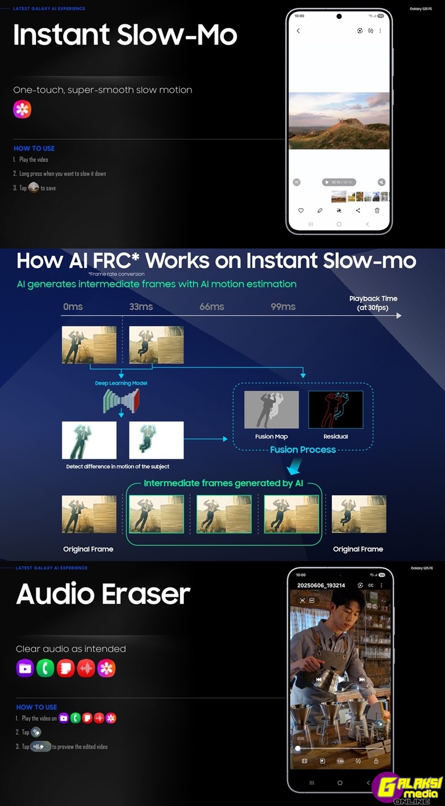 Bagi yang suka menghasilkan kandungan, Galaxy S25 FE dilengkapi pelbagai alat suntingan unik. Instant Slow-mo boleh menukar apa-apa video menjadi gerakan perlahan hanya dengan satu sentuhan, Audio Eraser membuang bunyi bising yang tidak diingini, manakala Auto Trim secara automatik memilih momen terbaik untuk video. Ciri seperti ini sebelum ini hanya ada pada model flagship.