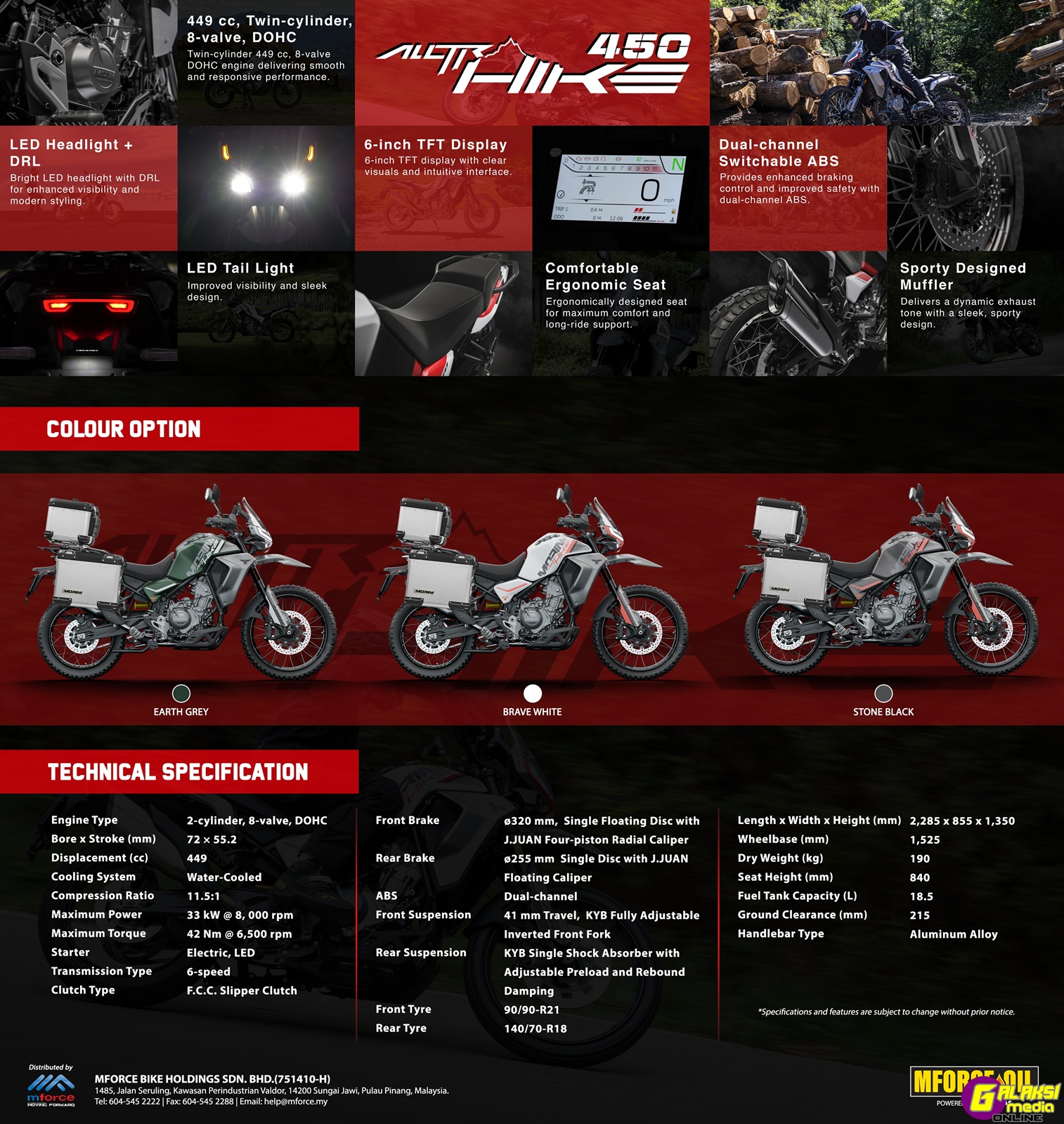 PULAU PINANG, 5 MAC 2026 – Mforce Bike Holdings Sdn. Bhd. dengan bangganya memperkenalkan MOTO MORINI ALLTRHIKE 450, sebuah motosikal adventure pertengahan yang direka untuk penunggang yang mahukan keseimbangan antara versatiliti, kawalan serta keupayaan touring dalam satu pakej lengkap.