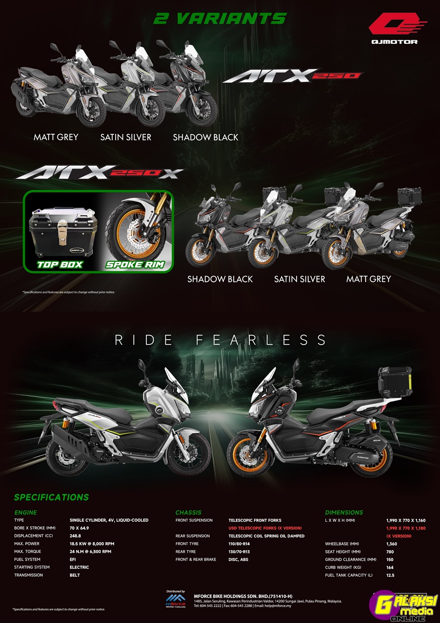 Setiap pembelian QJMOTOR ATX250 dan QJMOTOR ATX250X disertakan dengan jaminan pengeluar selama dua tahun dengan perbatuan tanpa had, serta akses kepada alat ganti tulen secara dalam talian melalui platform perkhidmatan Mforce Bike Holdings Sdn. Bhd. Kedua-dua model ini kini tersedia di pasaran Malaysia dan boleh didapati di semua pengedar sah Mforce di seluruh negara.