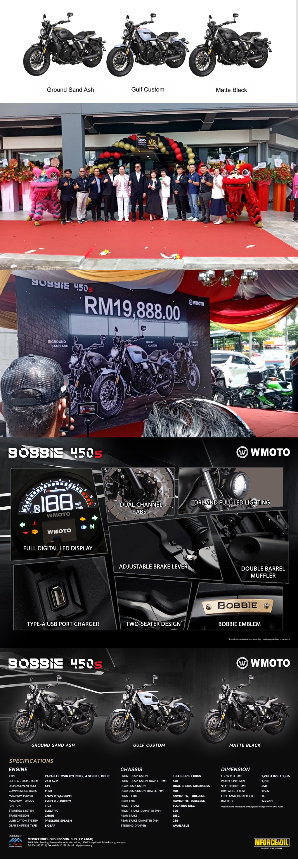 JOHOR BAHRU, 19 OKTOBER 2025 – Sempena Majlis Perasmian Mforce Best Shop Johor Bahru by Meng Soon Auto Sdn. Bhd., WMOTO dengan bangganya memperkenalkan model terbaharu dalam segmen cruiser, iaitu WMOTO Bobbie 450s. Motosikal ini menyerlahkan gabungan sempurna antara rekaan klasik dan teknologi moden, menawarkan pengalaman tunggangan yang premium, berkuasa serta penuh gaya.
