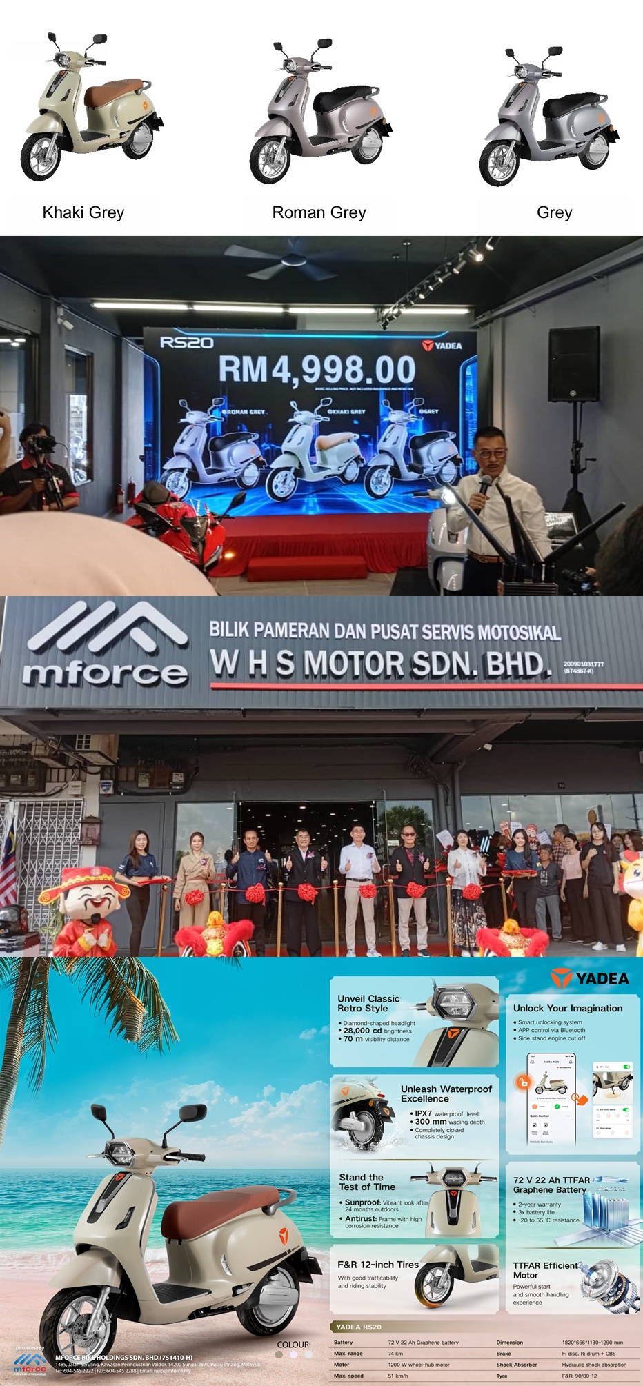 SELANGOR, 17 OGOS 2025 – Bersempena Majlis Perasmian Mforce SmartShop W H S Motor Sdn. Bhd. di Banting, yang merupakan Mforce SmartShop ke-18 di Malaysia dan ke-5 di negeri Selangor, YADEA Malaysia dengan bangganya memperkenalkan YADEA RS20, sebuah skuter elektrik serba moden yang menggabungkan gaya, prestasi dan kemudahan untuk kegunaan harian.